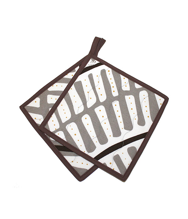 En snygg fyrkantig grytlapp / pannlapp. Passar perfekt till ugnsformar och grytor. Med denna slipper du bränna dig när du till exempel hanterar grytor och kastruller och ser dessutom snygg ut när den hänger i köket. Grytlappen har ett härligt mönstrat tyg i vitt, beige, svart och grått. Kantband i brunt.