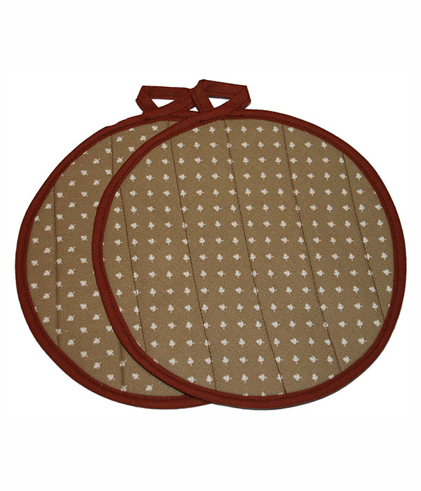 En snygg rund grytlapp / pannlapp. Passar perfekt till ugnsformar och grytor. Med denna slipper du bränna dig när du till exempel hanterar varma grytor och kastruller och ser dessutom snygg ut när den hänger i köket. Grytlappen har en snygg brun färg med mörkbrunt kantband.