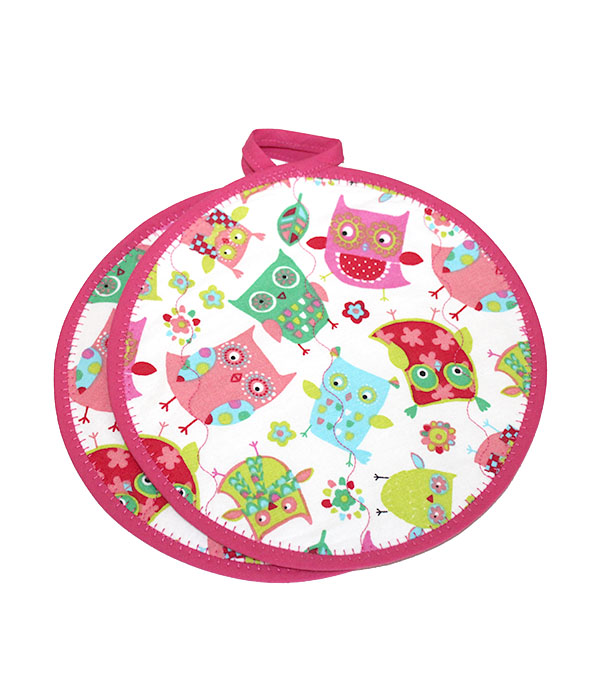 En snygg rund grytlapp / pannlapp. Passar perfekt till ugnsformar och grytor. Med denna slipper du bränna dig när du till exempel hanterar grytor och kastruller och ser dessutom snygg ut när den hänger i köket. Grytlappen har härligt tyg med vit botten och fina färgglada ugglor på och har cerise kantband. Baksidan är enfärgat rosa.