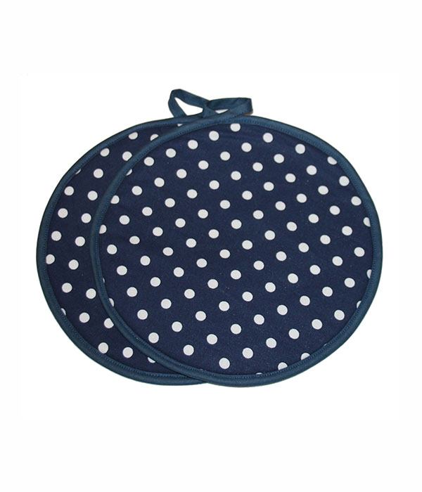 En snygg rund grytlapp / pannlapp. Passar perfekt till ugnsformar och grytor. Med denna slipper du bränna dig när du till exempel hanterar grytor och kastruller och ser dessutom snygg ut när den hänger i köket. Grytlappen har mörkblått tyg med vita prickar, vilket ger en härlig retrokänsla!